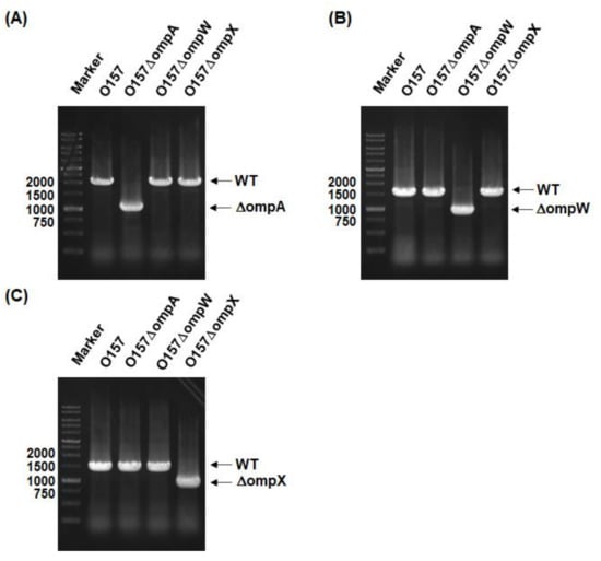 We constructed in-frame deletion mutants of the ompA, ompW, and ompX genes. The gene deletions were confirmed by PCR assays. The DNA fragments were amplified from the chromosomal DNA templates of the EHEC O157 parent strain and its mutants with the delta1 and delta4 primer pairs shown in the Materials and Methods section. When the ompA, ompW, and ompX genes are intact, the predicted sizes of the PCR products are approximately 1950, 1550, and 1430 base pairs, respectively. If these genes are deleted, those of the resulting fragments are shortened to approximately 900 base pairs. We observed the shortened PCR fragments corresponding to gene deletions from the chromosomal DNA templates of the ompA, ompW, and ompX mutants (Figure 1A–C).