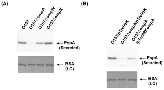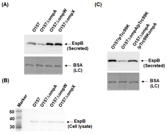OmpA, OmpW, and OmpX have common eight-stranded β-barrel structures although they do not share sequence homology []. However, in contrast to ompA deletion, deletion of ompW and ompX did not decrease EspB levels (Figure 2). P. aeruginosa and some Vibrio species produce high levels of OmpW orthologs. In P. aeruginosa, a mutant lacking OmpW is less cytotoxic to human bronchial epithelial cells, while a similar V. cholerae mutant is unable to colonize in mice [,]. Meanwhile, the OmpW protein is considered a minor outer membrane protein in E. coli because its production level is relatively low compared to other major outer membrane proteins, such as OmpA []. This may explain why the ompW deletion did not affect EspB secretion. Similarly to OmpA, OmpX is highly expressed in E. coli, and both proteins share highly conserved transmembrane domain structures []. However, unlike OmpA, OmpX lacks a periplasmic domain, which may help determine the roles of these proteins play in pathogenicity. The distinctive roles of OmpA and OmpX in pathogenesis have been observed in UPEC. On the one hand, deletion of ompA impairs colony formation in the urinary tract of mice, although the ompA mutant still retains the ability to aggregate within bladder epithelial cells [,]. On the other hand, deletion of ompX results in defective bacterial aggregation with reduced colonization in the urinary tract of mice [].