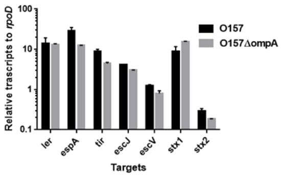 Transcript levels of LEE and stx genes in the O157 parent strain and the ompA mutant. Transcript levels were represented as relative values to that of rpoD (housekeeping gene). Data plotted are the means of two biological replicates, error bars indicate the ranges.