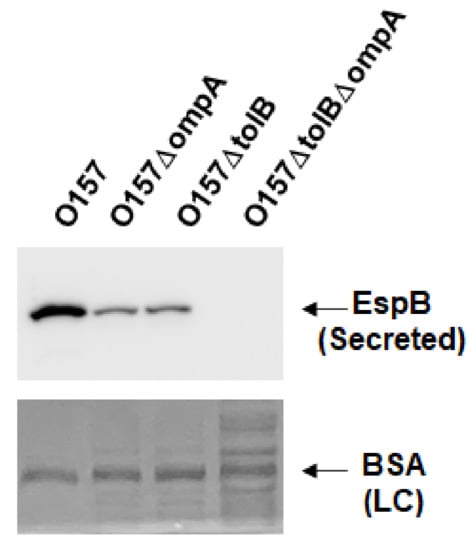Extracellular (secreted) EspB levels in the O157 parent strain and the ompA and tolB mutants. The parent strain and the ompA and tolB mutants were grown, then we determined extracellular EspB levels. EspB was visualized by western blotting with EspB antiserum. For loading control (LC), BSA was visualized by CBB staining.