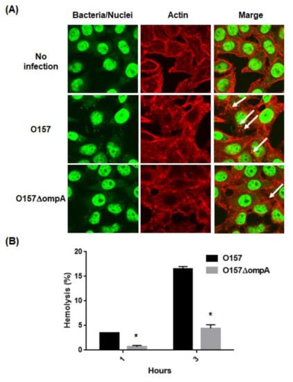 T3SS biological activities in the parent strain and ompA mutant. (A) A/E lesion formation in HeLa cells infected with the parent strain and ompA mutant. Bacteria and nuclei of HeLa cells stained with Hoechst33342 and actins strained with rhodamine-phalloidin were imaged, respectively, as green and red colors in the microscopy images using 100× objective. A/E lesions were indicated by white arrows as regions where actin was accumulated with bacteria. (B) T3SS-dependent RBCs hemolysis. Hemolysis (%) was represented as percent values of lysed RBCs (see Section 4). Data plotted are the means; error bars indicate the standard deviations. Asterisks denote significance for values of percent hemolysis for ompA mutant relative to those for the parent strain (p < 0.05).