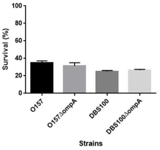 We suspected that the ompA mutant is more susceptible to acid than the parent strain, and its defective virulence is due to its low ability to survive the acidic conditions of the gastric transit after oral infection. However, after growing both the parent strain and ompA mutant in an acidified medium (pH 3.5), we found no significant difference in their survival rates (survival rates: 25.0 ± 0.8% and 26.5 ± 0.7% for the DBS100 parent strain and the ompA mutant of DBS100, respectively; 34.9 ± 1.7% and 31.5 ± 2.6% for the EHEC parent strain and the ompA mutant of EHEC, respectively) (Figure 8). Therefore, the defective virulence of the ompA mutant is not due to a higher susceptibility to acid.
