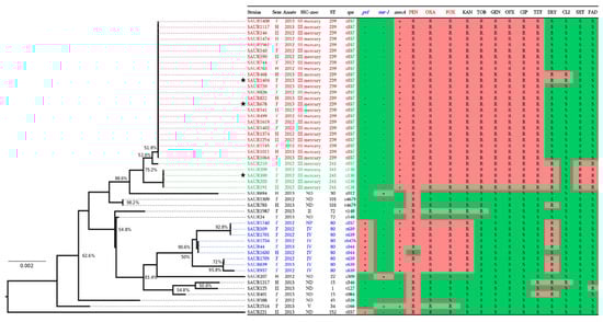 | Aminoglycosides | ant(9)-Ia; aph-Stph; aadC; aph(3′)-IIIa; aac(6′)-Ie-aph(2′’)-Ia | aph-Stph; aad(6); aac(6′)-Ie-aph(2′’)-Ia; aph(3′’)-Ib; aph(6)-Id; aph(3′)-Ia; aph(3′)-IIIa | aph-Stph; aph(6)-Id; aac(6′)-Ie-aph(2′’)-Ia |