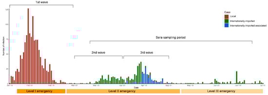 Between 19 January and 1 July 2020, Guangdong recorded 1961 laboratory-confirmed SARS-CoV-2 infections, with 1642 symptomatic COVID-19 cases, over three waves of activity that were characterized by distinct infection sources (Figure 1). The first wave, from January 14 to February 29, with a total of 1350 COVID-19 cases, was largely seeded by cases originating from Wuhan or Hubei [9] and remained the largest epidemic wave in the province so far. Cases were reported in 20 of the 21 prefecture-level cities in Guangdong (Yunfu reported no case) and were also highest in cities that had high migration activities from Wuhan in the five days prior to the national lockdown (Table 1, Figure 2A). The second outbreak, from March 1 to April 1, involved 161 infections that were mainly imported internationally while the third outbreak from 2 April to 2 May, involved 310 imported and associated-local cases. By 1 July, 1020 (62%) of the COVID-19 cases were reported mainly in Guangzhou and Shenzhen, which were also the major international port-of-entries, while the surrounding cities in the PRD recorded 478 (29%) cases (Table 1). As minimal cases were reported in all other cities after the first wave, the transmission trend across the province during the sera sampling period largely remained the same as in March.