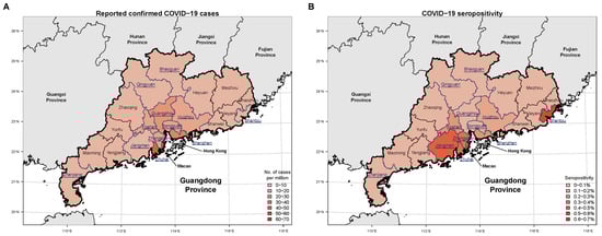 (A) Reported confirmed COVID-19 cases based on local official surveillance data in the different prefectural cities in Guangdong province. Asymptomatic infections were not available at a prefectural-city level. (B) Seropositivity of antibodies to SARS-CoV-2 as identified from the present study, in prefectural cities of the Guangdong province within the first six-months post COVID-19 emergence. Cities that had relatively higher connectivity with Wuhan prior to 23 January 2020, were underlined and highlighted in blue.