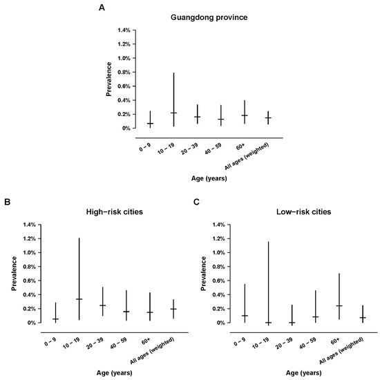 Estimates of age-specific SARS-CoV-2 seroprevalence in Guangdong province in (A) all cities or stratified by (B) high or (C) low risk of COVID-19 activities according to local official surveillance data. Seroprevalences in all ages were age- and sex-weighted according to the population structure of the included cities.