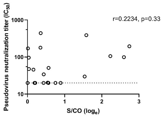 Correlation between the SARS-CoV-2 IgG titers and pseudovirus neutralization titers, expressed as 50% inhibitory concentration (IC50). The signal to cut-off (S/CO) readout on the X-axis were loge transformed to aid visualization of data points.