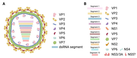 Schematic representation of bluetongue virus (BTV). (A) The bluetongue viral particle is composed of an outer capsid that consists of the VP2 and VP5 proteins, and an inner core formed by the VP7 and VP3 proteins. VP3 anchors the RNA polymerase VP1 to the capsid. The RNA capping and methyl transferase VP4 and the helicase VP6 are associated with VP1. Enclosed within the inner core, the BTV genome consisting of 10 segments of dsRNA is found. (B) The segmented genome of BTV encodes for 7 structural proteins (VP1 to VP7) and at least 4 non-structural proteins (NS1 to NS4). Segment 1 encodes for the RNA polymerase VP1. Segment 2 encodes for the highly variable VP2. Segment 3 encodes for the inner core protein VP3. Segment 4 encodes for the methyl transferase and RNA capping enzyme VP4. Segment 5 encodes for NS1, a non-structural protein that forms cytoplasmic tubules. Segment 6 encodes for the outer capsid protein VP5. Segment 7 encodes for the inner core protein VP7. Segment 8 encodes for NS2, an RNA binding non-structural protein expressed in viral inclusion bodies. Segment 9 encodes for the helicase VP6 and for NS4, a non-structural protein involved in immune evasion. Segment 10 encodes for NS3 and its isoform NS3a, which are polyfunctional non-structural proteins involved in viral particle exit from the cell as well as in interference with the mammalian IFN system. Segment 10 also putatively encodes for a fifth non-structural protein (NS5), which could be implicated in cellular shutdown. (Created with Biorender.com).