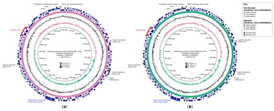 Genomic comparisons between Chlamydia pecorum MC/MarsBar_2018 and DBDeUG_2018, and their respective draft assemblies. (a) Circular representation of the chromosome of C. pecorum strain MC/MarsBar_2018 (GenBank: CP080403). (b) Circular representation of the chromosome of C. pecorum strain DBDeUG_2018 (GenBank: CP080401). The innermost rings represent the position in the genome in base pairs, GC skew, and GC content. Ring 4 represents nucleotide identity between sequences according to BLASTn (50 to 100%) between the complete chromosome and respective draft assembly. The coding sequence (CDS) for the forward (ring 5) and reverse (ring 6) strand is plotted in navy. Ring 7 highlights regions of interest. Circular genome plots created using BRIG v0.95 [].