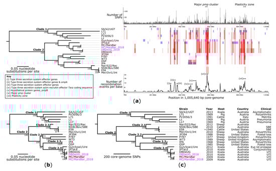 In Chlamydiae, the acquisition of genomic material from other species is considered uncommon []. Previous genomics studies have however, determined that recombination is common within C. trachomatis [,,,]. Previous C. pecorum WGS studies removed SNPs within recombination regions in a ~280 kbp core-genome alignment []. Thereby, to the best of our knowledge, regions of recombination have not yet been investigated in C. pecorum. To assess this and predict regions of recombination, we analysed the genome alignment using Gubbins. This identified seven major regions of recombination, with high SNP densities in and surrounding the major pmp gene clusters, T3SS genes, ompA region, and PZ (Figure 2a). Notably, a similar pattern of recombination was observed for the SEQ koala clade. Of the initial 14,504 core-genome SNP alignment, 10,479 (72.2%) SNPs were in regions of recombination and were removed from downstream analyses.