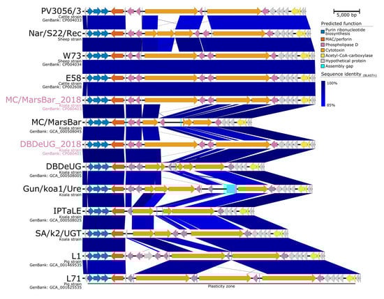 To investigate genomic differences between koala-derived C. pecorum, the five koala C. pecorum genomes were analysed and compared. As evaluated by whole-genome alignments, the koala C. pecorum genomes are largely syntenic with similar predicted CDS counts (936 to 996) and order, and share >99.7% nucleotide identity (Supplementary Materials, Figure S2). Most sequence variation was found in the same chromosomal regions as indicated above (such as T3SS genes, ompA, pmp clusters, and the PZ; Supplementary Materials, Figure S2), although previous studies have shown the difficulty in accurately analysing these regions due to incomplete assemblies. In our resequenced genomes, where the PZ was well assembled, the PZs in MC/MarsBar_2018 and DBDeUG_2018 were conserved and syntenic with that of C. pecorum from livestock (Figure 3), with 96.5% nucleotide identity to E58, and 97.5% nucleotide identity to each other.