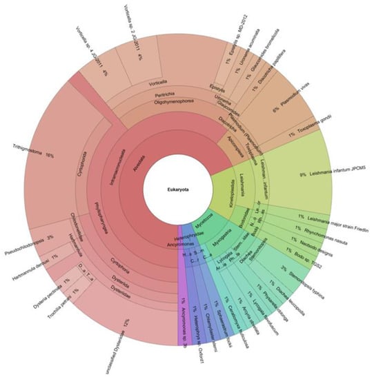 - Ondov, B.D.; Bergman, N.H.; Phillippy, A.M. Interactive Metagenomic Visualization in a Web Browser. BMC Bioinform. 2011, 12, 385. [Google Scholar] [CrossRef] [Green Version]