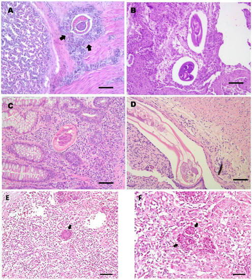 (A) Common buzzard (B. buteo), histology of the gizzard infected by P. mansioni, at the level of the isthmic area. Granuloma with the presence of a parasite; the granuloma wall consists of a mixed population of mono- and polymorph nuclear cells (heterophilic granulocytes, numerous lymphocytes, plasma cells, and macrophages—arrows). The lesion is recently formed and not well encapsulated by peri-nodular fibroblasts proliferation. (B) Common buzzard (B. buteo) histology of the proventriculus infected by P. mansioni: two parasites inside the mucosa can be observed, surrounded by a pyogranulomatous inflammatory infiltrate. Note the necrotic areas around the two parasites and the ulceration of the proventricular mucosa above the area of mucosal inflammation. (C) Common buzzard (B. buteo) histology of the small intestine with severe parasite colonization (mainly by B. falconis). The histological section shows a parasite localized in a deep portion of the mucosa in the small intestinal crypt area, surrounded by an acute inflammatory reaction, characterized by a large number of heterophils and eosinophils granulocytes, in the absence of mesenchymal reaction and/or fibrosis. (D) Honey buzzard (Pernis apivorus); histology of the jejunum parasitized by Raillietina apivori, characterized by chronic-active inflammation, infiltrating a segmental tract of the organ wall, with the presence of a parasite in the lumen. (E,F) Common buzzard (B. buteo), histology of the liver in a Salmonella typhimurium-infected bird: note the classic micro-granulomas, also called “typhoid-like” nodules, which show a center of unstructured necrosis surrounded by some inflammatory cells represented by heterophilic granulocytes and some mononuclear cells (arrows) without a capsule. H&E; scale bar = 500 µm (A, B, and E); 250 µm (C, D, and F).