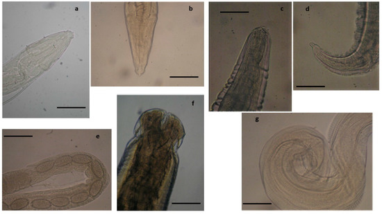 Nematodes identified in the sparrowhawk. Anterior (a) and posterior (b) end of Synhimantus (Dispharynx) falconis, scale bar 300 µm. Anterior (c) and posterior (d) end of Physaloptera alata, scale bar 500 µm. (e) Detail of a capillariid adult female with eggs, scale bar 70 µm. (f) anterior end of Porrocoecum angusticolle, scale bar 0.5 mm. (g) posterior end of a Procyrnea leptoptera adult male, scale bar 350 µm.