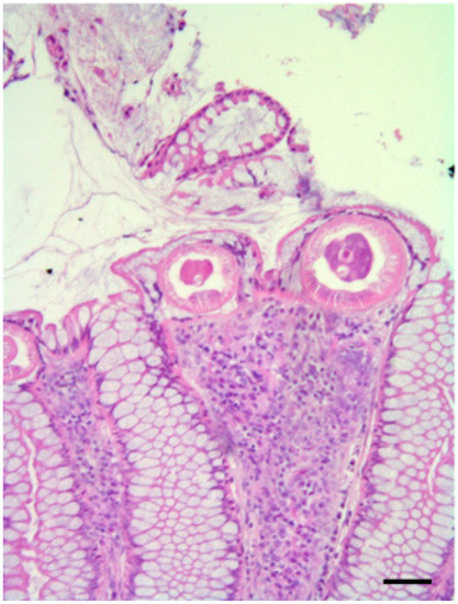 Presence of sub-epithelial parasites in the intestine of a B. falconis-infected Eurasian sparrow hawk (A. nisus). Diffuse chronic interstitial inflammation with the presence of transmural infiltrate of lymphocytes and plasma cells in the presence of parasites. Note the presence of diffuse mucinous metaplasia of the colonic mucosa, with a total transformation due to an overgrowth of goblet cells. H&E; scale bar = 150 µm.