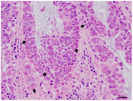 Jejunal mucosa of little owl (A. noctua); chronic inflammatory infiltrate in an interstitial diffuse form, associated with the large presence of apicomplexan protozoa in the epithelium (various stages of the life cycle—arrows) or inside macrophages interspersed in the intestinal wall. H&E; scale bar = 100 µm.