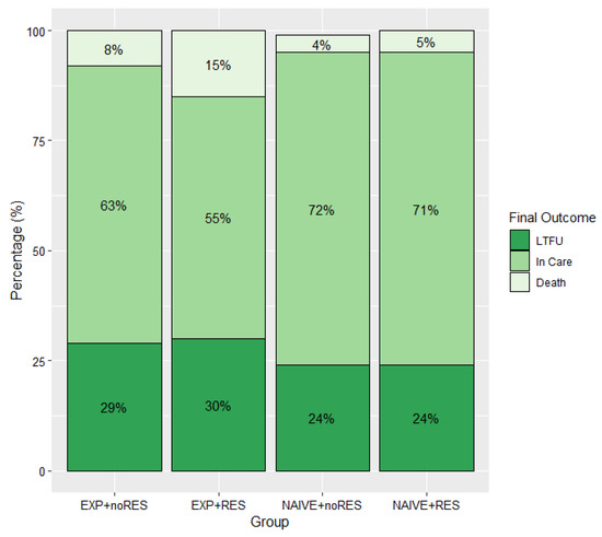 Considering 1823 persons with an HIV drug resistance test and information available in SALVAR, the present study represented 3034.3 person-years of follow-up. At the end of follow-up, 1276 (70%) of participants were reported as “in care” in SALVAR, 102 (6%) were reported as dead, and 435 (24%) were reported as LTFU. Among participants classified as LTFU, no specific reason was registered for 206 (46%), while 147 (33%) reported a change to a different health system (mainly due to employment status change and acquisition of social security), 82 (18%) left care for other reasons, and 10 (2%) discontinued ART. The distribution of final outcomes by group was non-significantly different (p = 0.06); however, we observed a higher proportion of participants retained in care among ART naïve persons (71%), compared to ART-experienced persons (63%, p = 0.002). Importantly, a trend toward higher mortality was observed in the experienced + resistant group (15%) compared to the experienced + non-resistant (8%), the naïve + non-resistant (5%), and the naïve + resistant (4%; p = 0.08) groups (Figure 1).