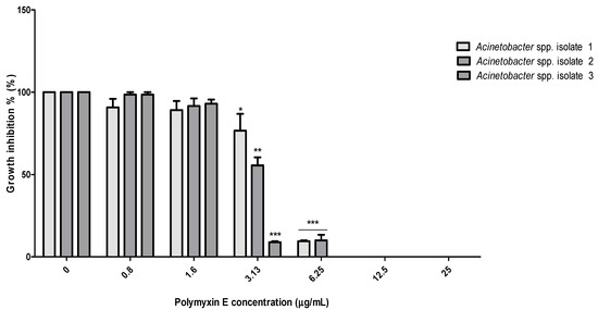 Antibacterial activity of polymyxin E against the selected Acinetobacter spp. isolates 1, 2, and 3. Data represented as mean MIC ± SEM (µg/mL) to three independent experiments. Asterisks refer to significance levels: * p < 0.05, ** p < 0.01, and *** p < 0.001.