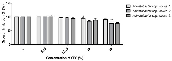 Regarding the MIC for the CFS of B. subtilis KATMIRA 1933, only the Acinetobacter spp. isolate 2 showed growth inhibition (p < 0.05) at a concentration of 25%. The Acinetobacter spp. isolates 2 and 3 were inhibited significantly (p < 0.01) at a concentration of 50% (Figure 2). Significant growth inhibition (p < 0.01) of Acinetobacter spp. isolates 2 and 3 was found at 12.5%, while at the highest concentration of B. amyloliquefaciens B-1895 CFS (50%), the bacterial isolates were dramatically inhibited (p < 0.001) (Figure 3). Efremenkova et al. [34] proposed that Bacillus strain 534 can produce active substances with different molecular sizes that target the cellular envelope of the pathogenic microorganisms. Several studies have been performed to evaluate the antimicrobial activity of the metabolites extracted from various species of probiotics against A. baumannii. Shin and Eom [3] referred to the antimicrobial activity of C. butyricum CFS against A. baumannii strains. In the presence of 50% of C. butyricum CFS, 98.51% of A. baumannii growth was inhibited. A study by Soltan et al. [35] showed that lactobacilli prevented the growth of A. baumannii and P. aeruginosa. During the stationary phase of growth, lactobacilli and bacilli strains secrete weak organic acids, bacteriocins, and biosurfactants. Bacteriocins are antimicrobial peptides ribosomally produced by virtually all microorganisms [36]. These peptides interact with the bacterial cell surface and cell membrane, leading to cell permeabilization and pore formation, and eventually, depletion of intracellular ATP (because of the collapse of the proton motive force) and cellular death (after leakage of intracellular substrates-please, see the review of Kumariya et al. [37]).