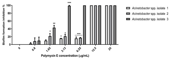 Anti-biofilm activity of polymyxin E against the selected Acinetobacter spp. isolates 1, 2, and 3. Data presented as mean MIC ± SEM (µg/mL) to three independent experiments. Asterisks refer to significance levels: * p < 0.05, ** p < 0.01, and *** p < 0.001.