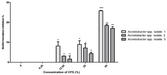 In our study, no MBIC value for the B. subtilis KATMIRA1933 CFS was determined against the selected isolates, even when the highest concentration of 50% was used. A concentration of 50% CFS of B. subtilis KATMIRA1933 prevented 7.3%, 23.3%, and 22.5% of the biofilm formation by Acinetobacter spp. isolates 1, 2, and 3, respectively, with a significant difference (p < 0.01) (Figure 6). Similarly, no MBIC was determined when B. amyloliquefaciens B-1895 CFS was used. However, a slight reduction (5–10%) was reported in biofilm formation by Acinetobacter spp. isolate 1 at 12.5% and 25% (Figure 7). At 50%, a significant (p < 0.01) reduction (48.7%) was reported in biofilm formed by the Acinetobacter spp. isolate 1. In the same regard, 50% CFS of B. amyloliquefaciens B-1895 significantly (p < 0.05) reduced biofilm formation by 28.4% and 33.6% for Acinetobacter spp. isolates 2 and 3, respectively.