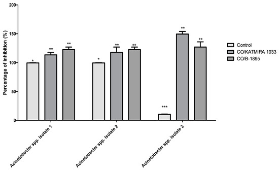 The MICs of polymyxin E and the tested probiotic CSF were determined for the selected Acinetobacter spp. isolates 1, 2, and 3 using the broth micro-dilution method. The MICs of polymyxin E were 3.13 μg/mL for Acinetobacter spp. isolate 3, whereas it was 6.25 μg/mL for both the Acinetobacter spp. isolates 1 and 3 (Figure 1). At these concentrations, bacterial inhibition growth was significantly inhibited (p < 0.001).
