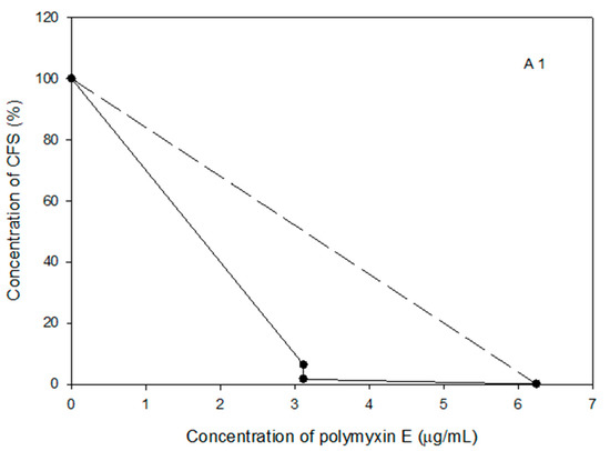 Synergistic activity was also noticed when polymyxin E was combined with the CFS of the probiotic strains against the Acinetobacter spp. isolate 3. The MIC of polymyxin E was 4-fold lower and the CFS of B. subtilis KATMIRA1933 was more than 8–16 fold lower (1.63 μg/mL of polymyxin E in combination instead of 6.25 μg/mL alone and 1.6–3.13% of CFS in combination compared to more than 50% when it was used alone) (Figure 9(B3)). Similarly, the MIC of polymyxin E was 4-fold lower, and the CFS of B. amyloliquefaciens B-1895 was more than 8–16 fold lower when combined (1.63 μg/mL of polymyxin E in combination instead of 6.25 μg/mL alone and 3.13–12.5% of CFS in combination compared to more than 50% when used alone) (Figure 9(A3)). The total ∑FIC showed synergy between polymyxin E and the CFS of the probiotic strains against the Acinetobacter spp. isolate 3. The ∑FIC was 0.381 and 0.272 when polymyxin E was combined with B. subtilis KATMIRA1933 and B. amyloliquefaciens B-1895, respectively, against biofilm cells.