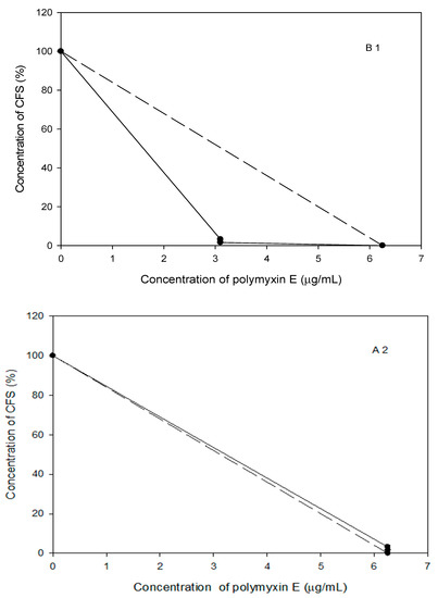 Regarding the Acinetobacter spp. isolate 2, synergistic activity was identified when polymyxin E was combined with the CFS of B. subtilis KATMIRA1933 but not with the CFS of B. amyloliquefaciens B-1895. The MIC of polymyxin E was 2-fold lower, and the CFS B. subtilis KATMIRA1933 was more than 17-fold lower than their individual MIC values (3.13 μg/mL of polymyxin E in combination instead of 6.25 μg/mL alone and 1.6–3.13% of CFS in combination compared to more than 50% when used alone) (Figure 9(B2)). An additive effect was reported when polymyxin E was combined with the CFS of B. amyloliquefaciens B-1895. The MIC of polymyxin E was not changed (6.25 μg/mL), while the MIC of the bacilli CFS was more than 16-fold lower (1.65–6.25% of CFS in combination compared to more than 50% when used alone) (Figure 9(A2)). The total ∑FIC showed synergism between polymyxin E and the CFS of B. subtilis KATMIRA1933 but not with the CFS of B. amyloliquefaciens B-1895 against the Acinetobacter spp. isolate 2. The ∑FIC was 0.516 and 1.02 when polymyxin E was combined with B. subtilis KATMIRA1933 and B. amyloliquefaciens B-1895, respectively, against biofilm cells.