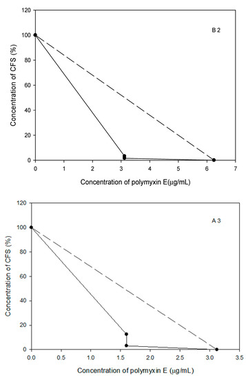 (A,B) (1–3). Isobolograms of polymyxin E in combination with CFS of probiotic strains against planktonic cells of the selected Acinetobacter spp. (A) B. amyloliquefaciens B-1895, (B) B. subtilis KATMIRA1933), (1–3) referred to the Acinetobacter spp. isolate numbers. The dashed lines connect the two MIC values (closed circles), while the solid lines connect the sub-MIC vlues (closed circles below the dashed lines).