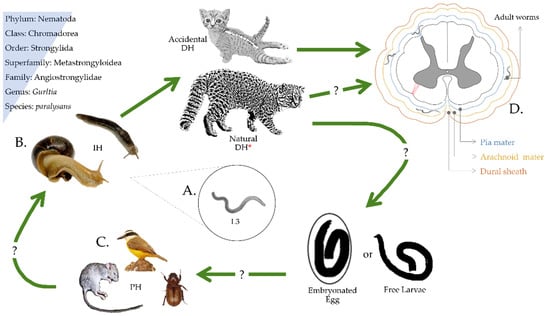Proposed life cycle of Gurltia paralysans. Felids become infected by consuming the L3 larvae (A) from an infected intermediate host (B) or paratenic host (C). L3 migrates from the intestinal tract to the central nervous system and invades the veins of the subarachnoid space (D) of the spinal cord. There, larvae mature to adult worms and produce eggs and reproduce through eggs. The elimination route of the eggs or first larval stage (L1) or how the intermediate host becomes infected with L1 is still unknown. * Definitive host.
