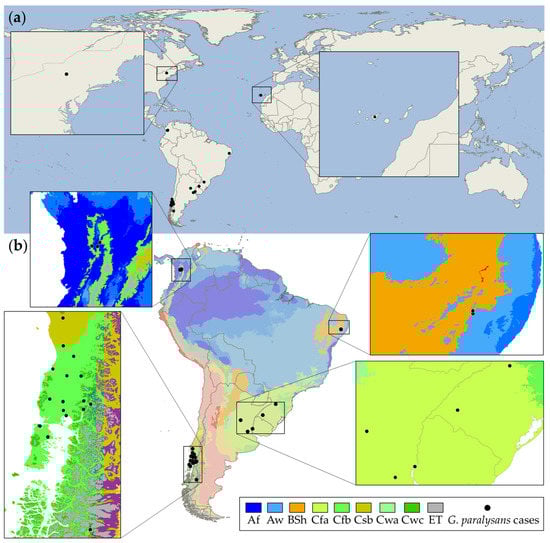 Worldwide reported cases of feline gurltiosis in domestic cats and wild felids. (a) Enlargement of the areas outside South America (i.e., Tenerife Island, Spain, and New York, NY, USA) where imported cases have been recorded. (b) Köppen–Geiger climate classification from South American case reports of the angio-neurotrophic parasite G. paralysans. Close-up location of the parasite reports from Colombia, Brazil, and the triple border area between Brazil, Uruguay, and Argentina. Additionally, feline gurltiosis hotspot area in Southern Chile where the most significant number of occurrence disease cases have been reported. Af: Tropical rainforest, Aw: Savanna, Bsh: Hot semi-arid, Cfa: Humid subtropical, Cfb: Oceanic, Csb: Warm-summer Mediterranean, Cwc: Monsoon-influenced subpolar oceanic, Cwa: Monsoon-influenced humid subtropical, ET: Tundra.