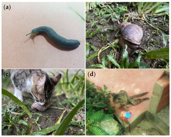 Ecoepidemiological factors that allow gurltiosis occurrence in the Colombian Andean region. Images of G. paralysans gastropod intermediate hosts (IH) such as (a) smooth land slugs of the genus Deroceras sp. found in the Southwest subregion of Antioquia, Colombia and (b) Giant African snail (Lissachatina fulica) in an urban environment (Medellín city). (c) The natural domestic cat’s curious behavior on a Giant African land snail favors close interaction with IH, demonstrating the feasibility of parasite transmission in urban areas. (d) Clinically ill mixed-breed domestic cat in an Andean rural area with long-lasting degenerative myelopathy and severe paraplegia.