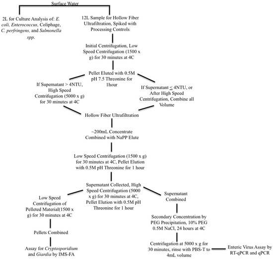 Pathogens were detected in nearly all surface waters. Salmonella spp. was found in 91% of all samples at concentrations from 0.1 to 1.2 MPN/100 mL. Adenoviruses (as detected by molecular methods) were found in 41% of all samples at concentrations ranging from 1 to 3.60 × 104 GECs/100 mL. Cryptosporidium and Giardia, as detected using US EPA Method 1623, were found in 100% and 81% of all samples, respectively. Total coliforms, E. coli, and Enterococcus were detected in 95%, 64%, and 50% of samples (respectively), while somatic, F+, and total coliphage viruses were detected in 77%, 32%, and 77% of samples, respectively. C. perfringens’ spores and vegetative cells plus spores were detected in 91% of all samples. As pathogen and indicator analyses were for different volumes of surface water (10 L for pathogens and 100 mL for indicators), it is likely that the different sample volume for pathogens and indicators impacted the detectability of each microorganism. In general, a larger sample volume and sample size is desirable and would improve pathogen detection.