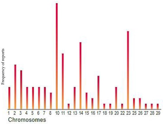 Distribution of tick resistance related QTL/associations in bovine, based on count of report data (sourced from: https://www.animalgenome.org/cgi-bin/QTLdb/BT/index (accessed on 4 September 2020).