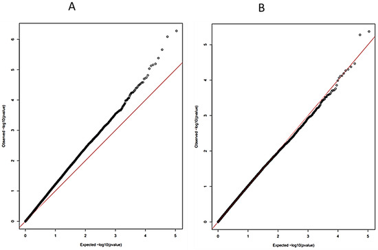 During the association analysis, population stratification is regarded as one of the confounding effects that can inflate the variance of the usual statistics [65]. The inflation of test statistics may potentially attribute high false positive discoveries; hence, it should be accounted for. There are two ways to account for population stratification in GWAS: the variance is adjusted using genetic control or principal component analysis. It was pointed out by [65] that genomic control adjusts the variance by calculating the statistics on data from null loci. Figure 2 shows the quartile–quantile plots before correction (A) and after (B). Figure 2A shows a departure from the diagonal observed, which indicates a high inflation rate. Figure 2B shows the improvement after correction using genomic control, where the inflation rate has decreased.