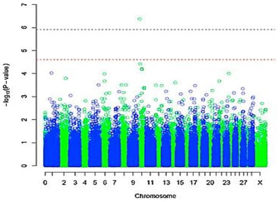 Manhattan plot showing findings for a single marker GWAS where the association of low tick load (total A. hebraeum ticks) and genotype was assessed in Nguni breed, using a genome-wide p value < 0.05 as a cut-off. The redline indicates suggestive threshold and the grey indicates the genome-wide cut off (taken from [8]).