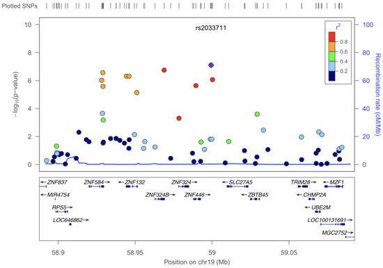 LocusZoom plot showing in depth findings for most significant SNPs in Chromosome 19, from a human GWAS that was focused to study genetic variation underlying renal uric acid excretion in Hispanic Children [75].