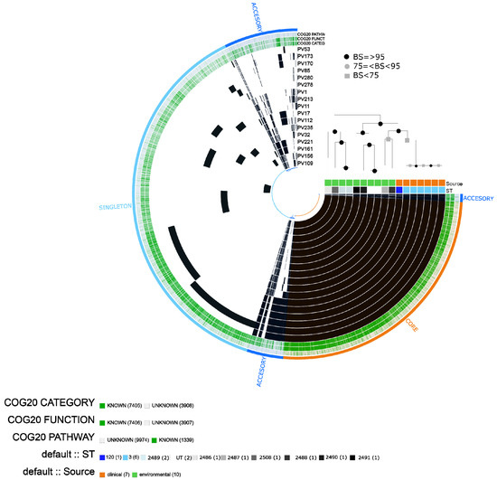 Vibrio parahaemolyticus pangenome based on 17 isolates analyzed. Presence/absence of gene clusters are represented by black and gray bars, respectively. Each bin within the pangenome is signaling core, accessory and singleton fractions. The labels represent in order: Number of gene clusters assigned to COG20_CATEGORY, COG20_FUNCTION and COG20_PATHWAY; each isolate (PV); information on ST; and source of the isolate (clinical/environmental). The pangenome is ordered according to a maximum likelihood (ML) tree based on 2149 single-copy concatenated core genes. Bootstrap supports (BS) are based on 100 replicates.