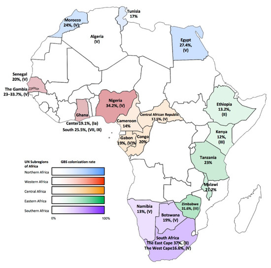 For Africa the picture is somewhat different, where serotypes V, III, Ia, Ib and II represent 91.8% of serotypes circulating among colonizing strains [23]. Epidemiological reports show serotype V is predominant in most regions of the African continent comprising not less than one third of the GBS isolates. This includes the North as reported in Egypt [26], Algeria [27] and Morocco [28]; in the West as shown in Senegal [29], Gambia [30,31] and Nigeria [32]; in central Africa as described in Gabon and Central African Republic [29]; the South as found in Botswana [33] and the Western Cape region of South Africa [34]. The reported prevalence ranged from 30.3 to 66.67%. serotype V also prevailed in Mozambique [13] and was common in central Ghana [35], Ethiopia [36], Zimbabwe [37,38,39] and Malawi [13]. The meta-analysis conducted by Gizachew et al., 2019 [23] showed serotype V accounting for 29.2% (95% CI 19.8, 38.6) of the GBS isolates as compiled from 14 African studies. GBS colonization rates and the main GBS serotypes for countries where data have been obtained are shown in Figure 1.