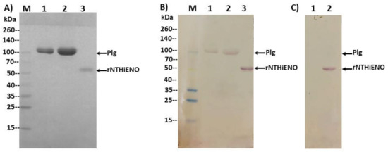 Figure 5. Identification of the binding of rNTHiENO to plasminogen by means of far western blotting. (A) Protein migration in SDS-PAGE: 10%. M: weight marker; Lane 1: Plg (5 μg); Lane 2: Plg (10 μg); Lane 3: rNTHiENO (3 μg). (B) Immunodetection of rNTHiENO–Plg interaction using polyclonal anti-rNTHiENO antibodies as the first antibody type, followed by incubation with IgG anti-mouse accoupled to alkaline phosphatase as the second antibody. After migration and electrotransference of proteins, and prior to the use of the antibodies, the blot was incubated with rNTHiENO. M: prestained protein marker; Lanes 1,2: rNTHiENO–Plg interaction; Lane 3: rNTHiENO. (C) A procedure like (B), but using only incubation with BSA as a negative control. Lane 1: Plg (5 μg), no signal was observed; Lane 2: rNTHiENO. The band corresponding to rNTHiENO (52.0 kDa) is indicated.
