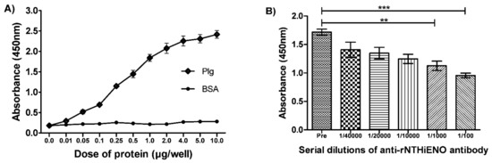 Figure 6. Identification of the binding of rNTHiENO to plasminogen by means of ELISA. (A) Plasminogen-binding assays. ELISA assays showed that the interaction between rNTHiENO and plasminogen (Plg) is concentration-dependent. Increasing amounts in concentrations (0.01–10 µg/well) of plasminogen or BSA were used as indicated in the plot. BSA was used as a negative control. Data represent the mean ± SD standard deviation of three independent experiments. (B) Detection by ELISA of the inhibition of the rNTHiENO–Plg interaction, using polyclonal anti-rNTHiENO antibodies at different dilutions (1/100 to 1/40,000). Pre: Preimmune serum (negative control). Data represent the mean ± SD standard deviation of three independent experiments. (*** p < 0.001): preimmune serum VS 1/100; (** p < 0.01): preimmune serum VS 1/1000.