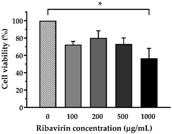 Toxicity of ribavirin against E-11 cells. The E-11 cells were treated with ribavirin at concentrations in the range 100–1000 µg/mL and then evaluated for cell survival at 7 days using a Cell Counting Kit-8 assay. The data represent the mean cell viability ± SEM from 3 replicates and the comparisons carried out using one-way ANOVA and Dunnett’s multiple comparison test. Significance (p < 0.05) is marked as *.