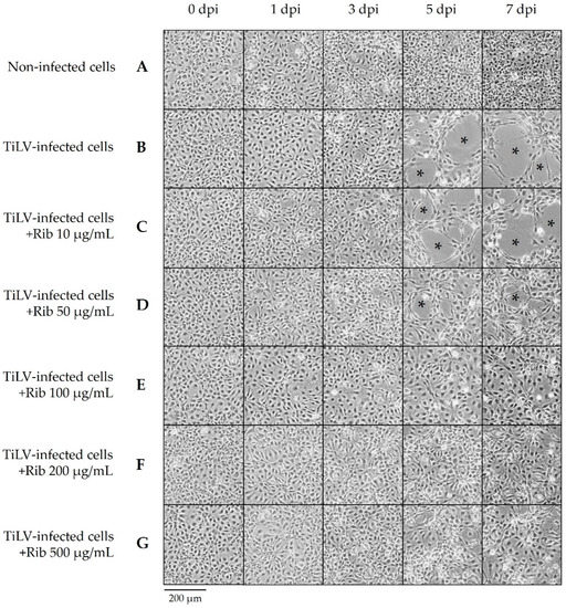 Ribavirin inhibited TiLV-induced CPE formation in E-11 cells in a dose-dependent concentration. Confluent E-11 cells were incubated with TiLV at a multiplicity of infection (MOI) of 0.46 for 1 h followed by ribavirin treatment. (A) Non-infected cells; mock-infected E-11 cells treated with an L-15 medium. (B) TiLV-infected cells without ribavirin. (C–G) The TiLV-infected E-11 cells were treated with serial dilutions of ribavirin at 10, 50, 100, 200, and 500 µg/mL. The cytopathic effect (CPE) formation (*) was monitored daily until 7 days post-infection (dpi).