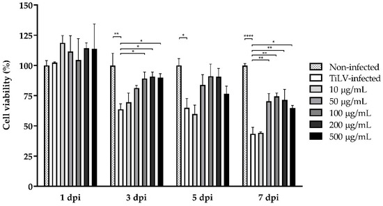 Survival of infected E-11 cells incubated with different ribavirin concentrations at 1, 3, 5, and 7 dpi. The percentage of surviving cells between the ribavirin-treated and sham-treated group was compared using two-way ANOVA followed by Bonferroni’s multiple comparison test. In the sham-treated group, the cell viability was reduced chronologically. Treating with ribavirin ranging from 100 to 500 μg/mL significantly improved the cell survival in a dose-dependent manner. The data are represented as mean + SEM from three replicates. Significance is indicated as * for p < 0.05, ** for p < 0.01, and **** for p < 0.0001.