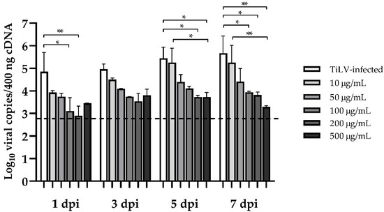 Effect of ribavirin treatment on TiLV RNA concentrations in E-11 cells. The cells were incubated with TiLV for 1 h followed by ribavirin at concentrations ranging from 10 to 500 μg/mL. The mean log10 viral copies between the ribavirin-treated cells and the sham (diluent)-treated cells were compared using two-way ANOVA followed by Bonferroni’s multiple comparison test. The data are represented as mean ± SEM from 3 replicates. Significance is indicated as * for p < 0.05 and ** for p < 0.01. The cut-off limit (dot line) was set at Ct 34, which equals 102.84 viral copies per 400 ng cDNA.