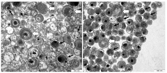 Electron micrographs of C. trachomatis serovar E (left panel) and serovar L2 (right panel) samples prepared by using Gastrografin® gradient centrifugation. Based on their characteristic morphological features, a mixture of EBs and RBs was detected in both preparations. EBs (black arrows) contain highly condensed material appearing as electron-dense and electron-lucent, whereas RBs (white arrows) represent larger structures containing relaxed, reticulated nucleoid material. Intermediate morphologies where characteristics of both are observed may represent IBs (grey arrows).