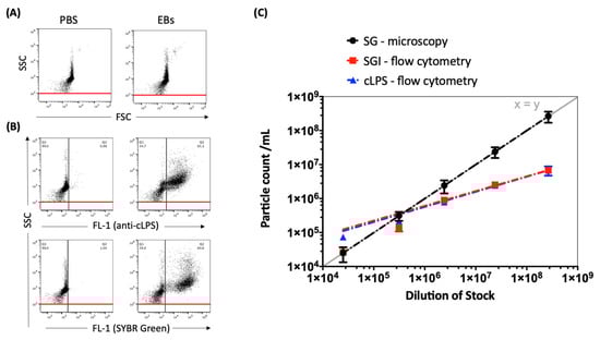 (A) Representative dot plots of C. trachomatis (serovar E) EB/RB preparations, side scatter (SSC) vs. forward scatter (FSC), compared to phosphate-buffered saline (PBS). (B) Representative dot plots of C. trachomatis preparations (concentration of 2.39 × 106/mL) stained with either FITC-conjugated cLPS mAb B410F or nucleic acid stain SGI; SSC (488-10+OD2 filter) vs. fluorescence intensity (FL-1, emission filter 530/30 nm, log scale) is shown. PBS supplemented with both dyes without EBs/RBs was measured to determine the background noise; fluorescence cut-off values were set at 1% (black line) and the SSC threshold at 100 (red line). (C) Counts of SGI- vs. cLPS-stained EB/RB-dilutions (from 1:100 to 1:1,000,000) measured by flow cytometry compared to the DPCs of SYBRTM Gold (SG)-stained EBs/RBs analyzed by epifluorescence microscopy. The exponential trend lines were fitted and shown with a graph of standard linear relation (y = x, grey line).
