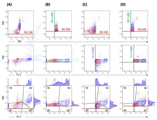 Standard instrument filter settings. Representative contour plots of EBs/RBs (serovar E) at a concentration of 2.39 × 107/mL stained with SGI (blue) in comparison to SGI-incubated PBS reagent control (red). The measurement was performed with different threshold settings: (A) SCC 100, (B) SSC 300 and FSC 1000, (C) SCC 100 and FL-1 5000, (D) SSC 300 and FSC 1000 and FL-1 5000. The thresholds are marked with corresponding lines (SSC 100 or SSC 300—red, FSC 1000—green, FL-1 5000—blue). The gating strategy (black lines) including the corresponding histograms with a definition of the positive population in gate quadrant 2 (Q2) is shown in the last row.