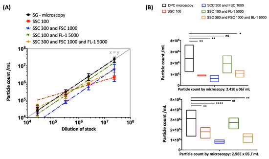 Comparative measurements of different threshold settings were performed at different serial dilutions. Different threshold settings show specific contour plot profiles (Figure 3). The DPCs measured by flow cytometry—when including the fluorescence (FL-1 5000) and SSC (SSC 100) threshold (Figure 3C)—were comparable to DPC by microscopy (p > 0.05). Other threshold settings did not achieve the same accuracy (Figure 4). In addition, we observed alterations in height (SSC-H) vs. area (SSC-A) plots between measurements with different threshold settings (Figure S1). The principle of height and area is described below in Materials and Methods.