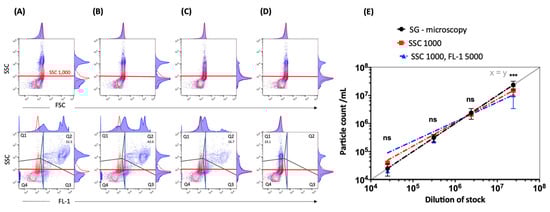 Consecutive measurements of the samples were performed by implementing the SSC 488-10 filter. A good separation of populations in the SSC was possible at different dilutions of the cell suspension (Figure 5A–C). This approach even made it possible to enumerate unstained particles at a concentration of 1 × 106–5 × 106 particles/mL (Figure 5D). This underscores the importance of appropriate dilution. The filter allows the omission of the fluorescence trigger without compromising the coincidence rate and, consequently, comparable particle counts using only the SSC trigger were achieved (Figure 5E). The advantage of measuring without the fluorescence trigger is the possibility to also visualize the unstained sample at the recommended coincidence rate.